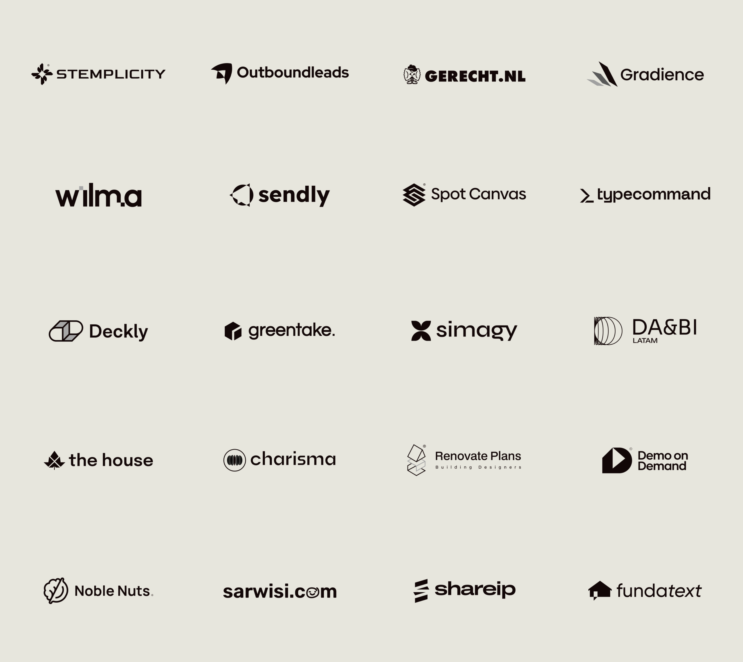 The collection combines symbol-based marks and typographic logos with a focus on clarity and form.