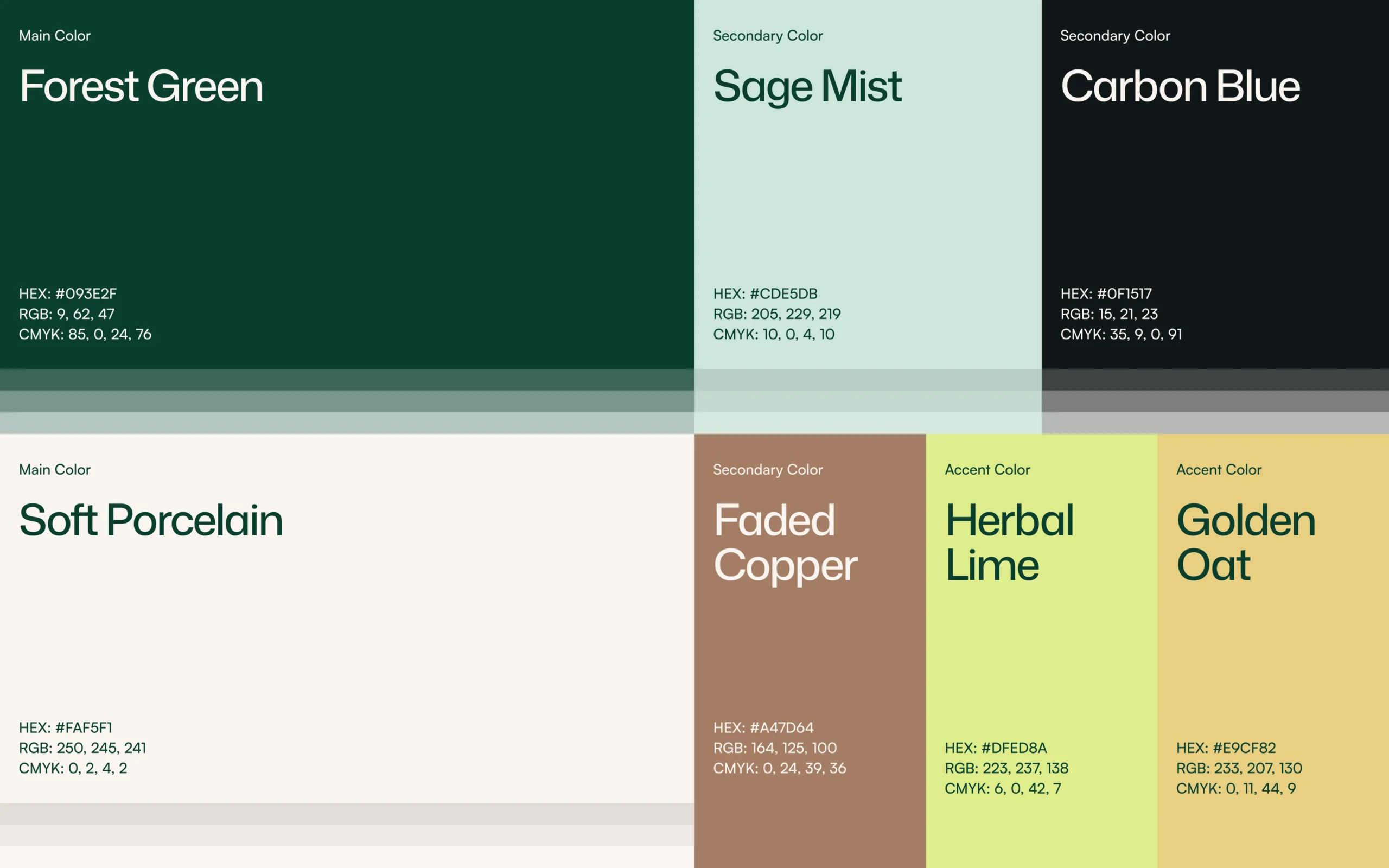 The color palette is inspired by natural tones, combining depth with softness to reflect the brand’s connection to the environment. Forest Green acts as the primary anchor, supported by lighter neutrals like Soft Porcelain for balance and clarity.