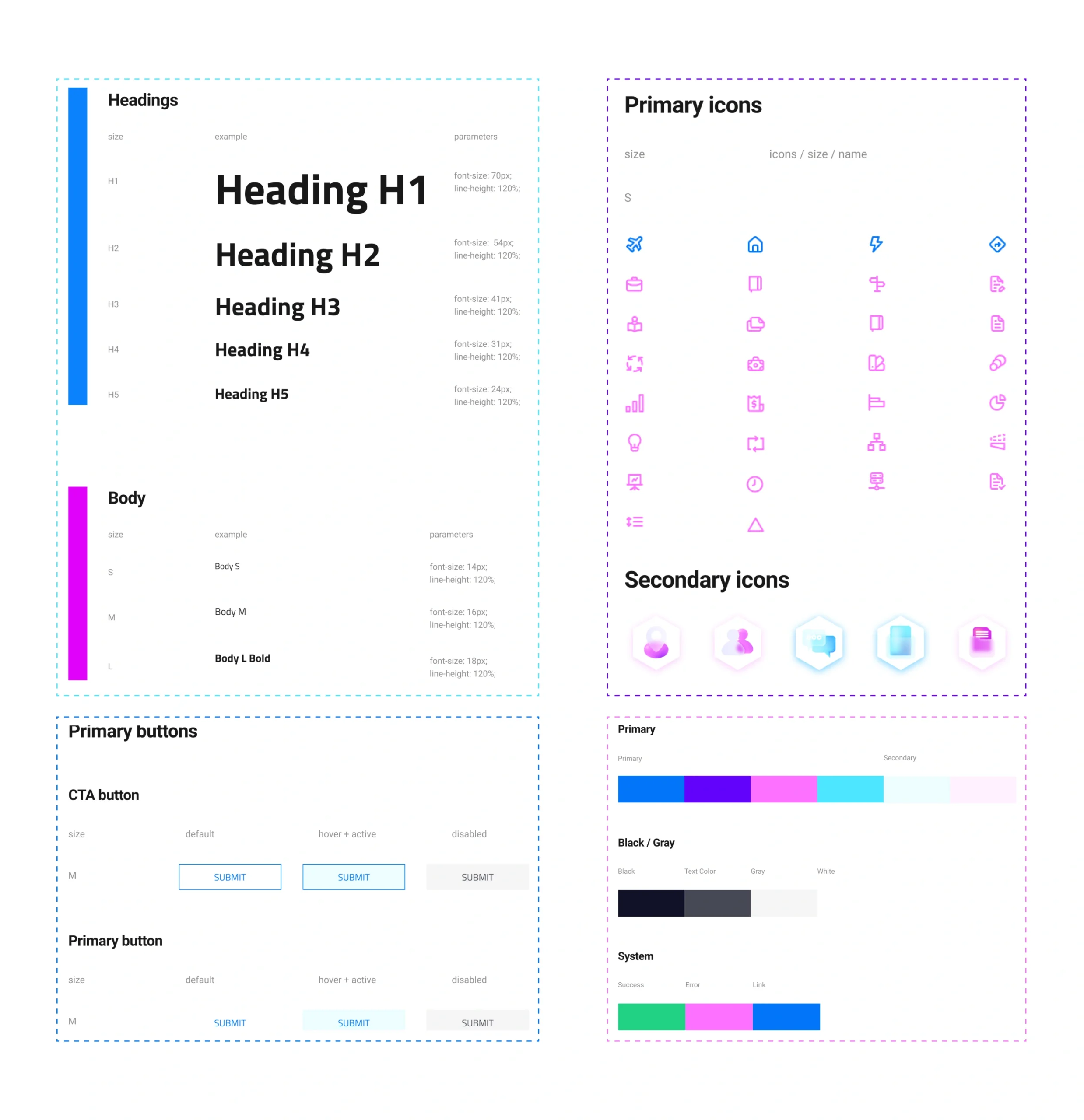 For colours, we went with a purple and blue palette, adding darker colours for contrast and some punchy accent shades to break up visuals and highlight key actions on the website.