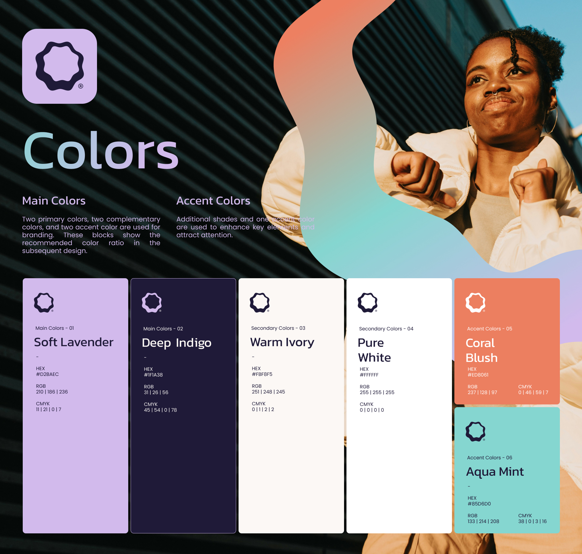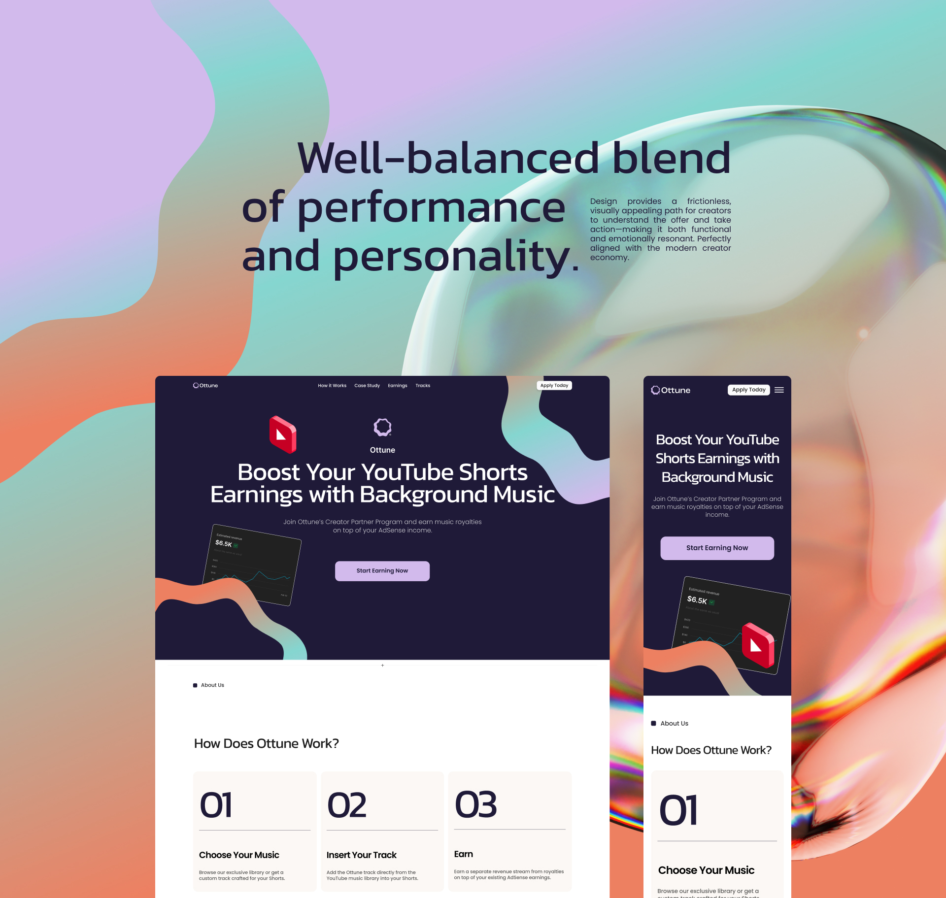 Інтерфейс користувача Ottune відображає той самий дух, що й загальна ідентичність бренду — чистий, сучасний та орієнтований на творця. Темний фон з яскравими акцентами: використання насиченого темно-синього та фіолетового кольорів дозволяє виділятися градієнтним відтінкам (персиковий, кораловий, м’ятний, бузковий), надаючи інтерфейсу преміального, але водночас яскравого вигляду.