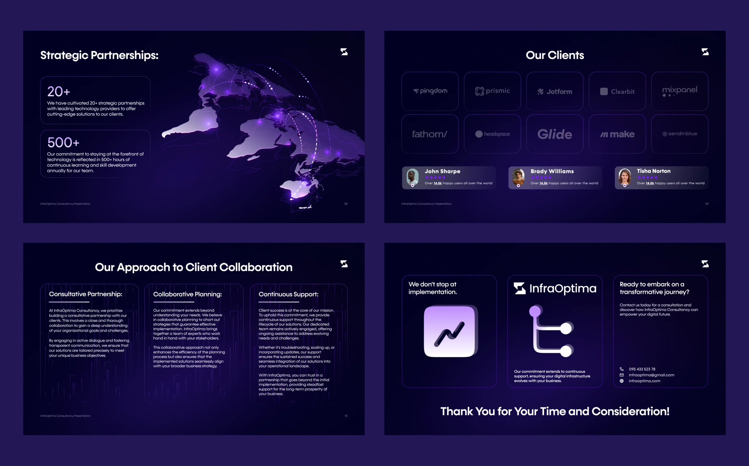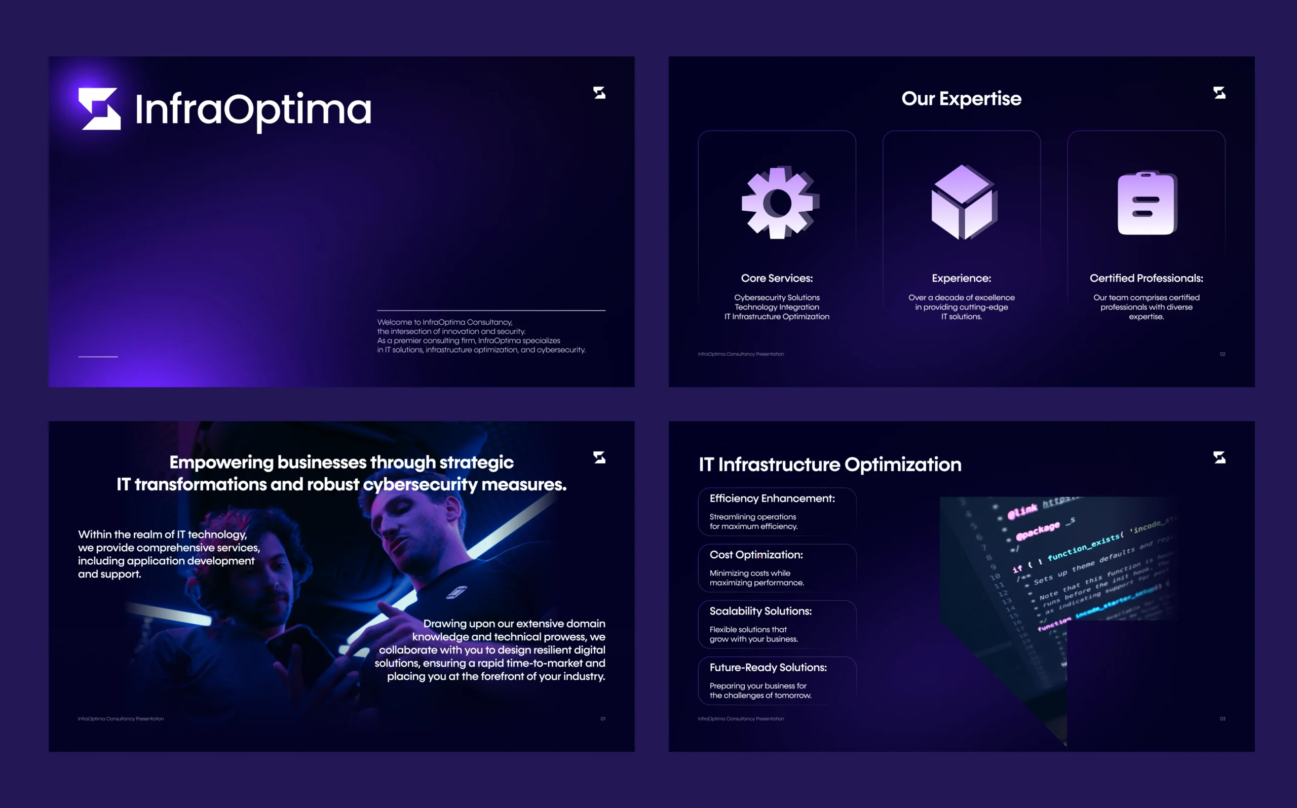 InfraOptima хотіли оновити комерційні пропозиції для клієнтів. Завдання полягало в створенні презентації, яка була б професійною, з акцентом на послуги та технічні можливості компанії, щоб клієнти могли чітко зрозуміти цінність InfraOptima. Окрім цього, ми створили шаблони деяких слайдів. Це дозволяє InfraOptima самостійно змінювати майбутні презентації, але зі збереженням єдиної візуальної концепції для всіх клієнтських комунікацій.