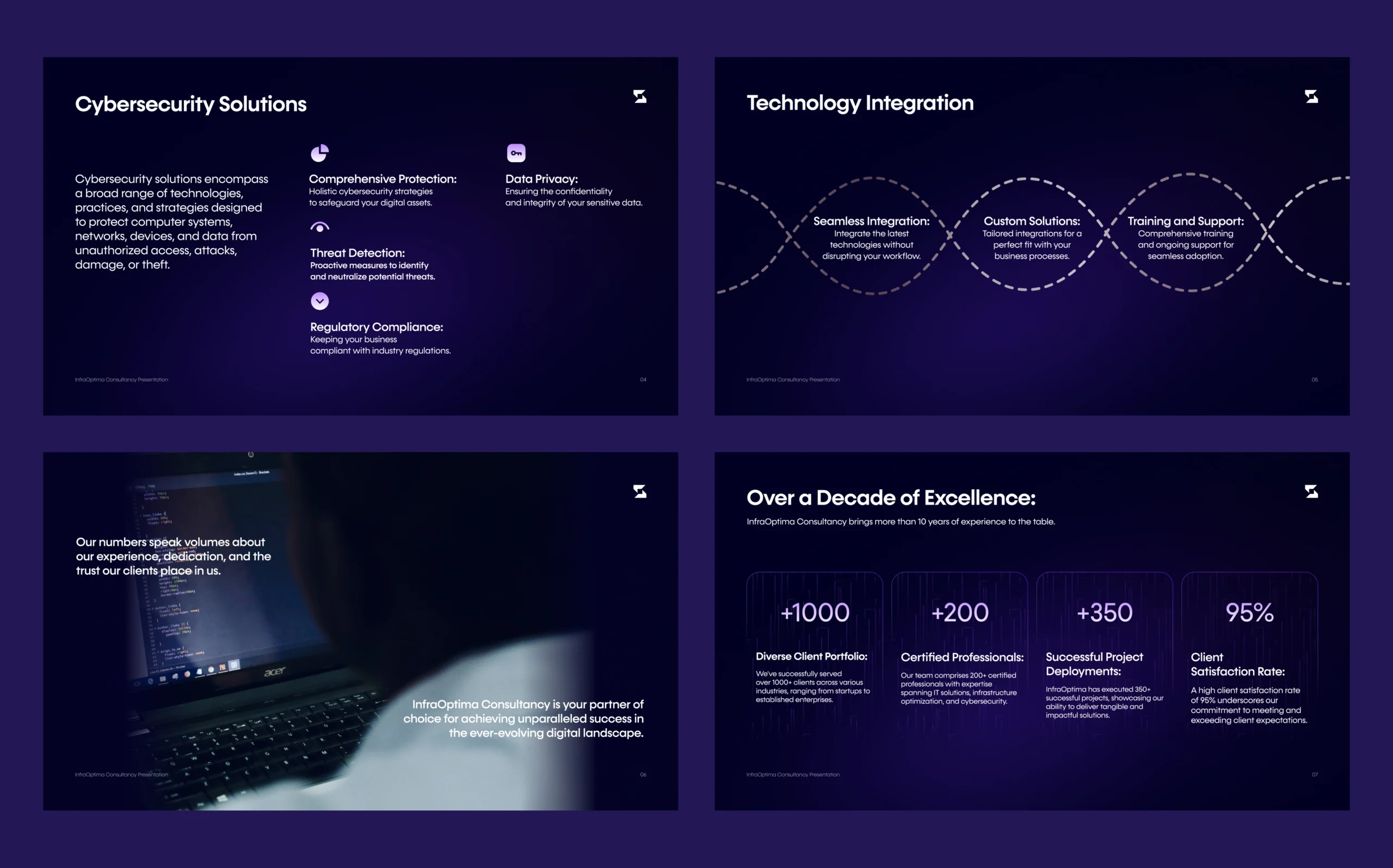 Ми розробили презентацію на 15 слайдів, яка підкреслює основні послуги InfraOptima, включаючи ІТ-рішення, розробку додатків і кібербезпеку. Дизайн команда зробила слайди легкими для сприйняття, щоб клієнти легко розібралися у широкому списку послуг.